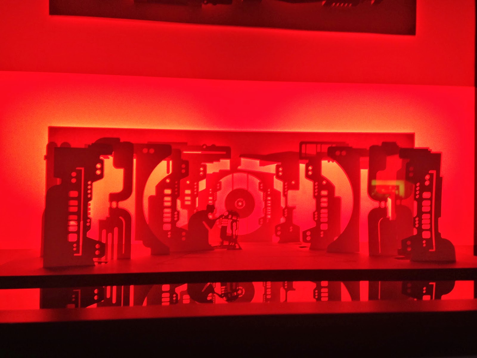 Le opere esposte, presso la 5th Gallery di Londra fino al 18 agosto, erano venti: ognuna è stata posizionata all’interno di una scatola trasparente e retro illuminata da diversi colori (ogni quadro una nuance). Mentre la luce filtrava nelle fessure, le scene prendevano vita nella loro complessità e i minuscoli dettagli rivelavano l’ambientazione fedele all’originale e la presenza di tutti i protagonisti della serie.