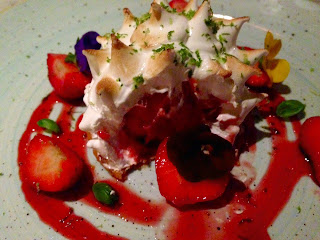 Per finire l’immancabile (per me) dolcetto,”Baked Alaska”: una pallina di sorbetto alla fragola ricoperta da meringa, il tutto decorato da fragole fresche, fiorellini e sciroppo alla fragola. Strepitoso!