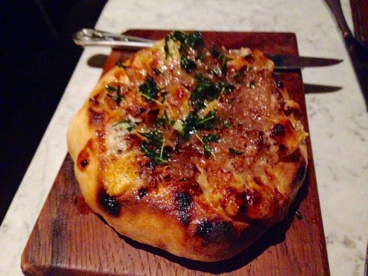 Il mio primo piatto è stato “Onion bread”, il pane caldo con cipolle e formaggio Stilton: ottimo, ha la consistenza di una focaccia e il sapore è memorabile.