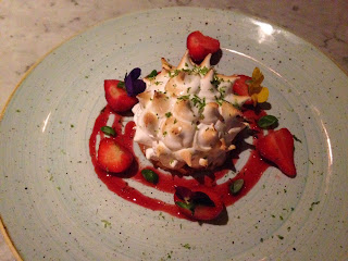 Per finire l’immancabile (per me) dolcetto,”Baked Alaska”: una pallina di sorbetto alla fragola ricoperta da meringa, il tutto decorato da fragole fresche, fiorellini e sciroppo alla fragola. Strepitoso!