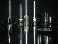 Una fila interminabile di persone si forma in uno stanzone buio, stiamo per entrare nella sala dei diamanti ma intanto inganniamo l’attesa ammirando vestiti preziosi e impalpabili che, come fantasmi, grazie a un gioco di luce, sembrano fluttuare nell’aria.
