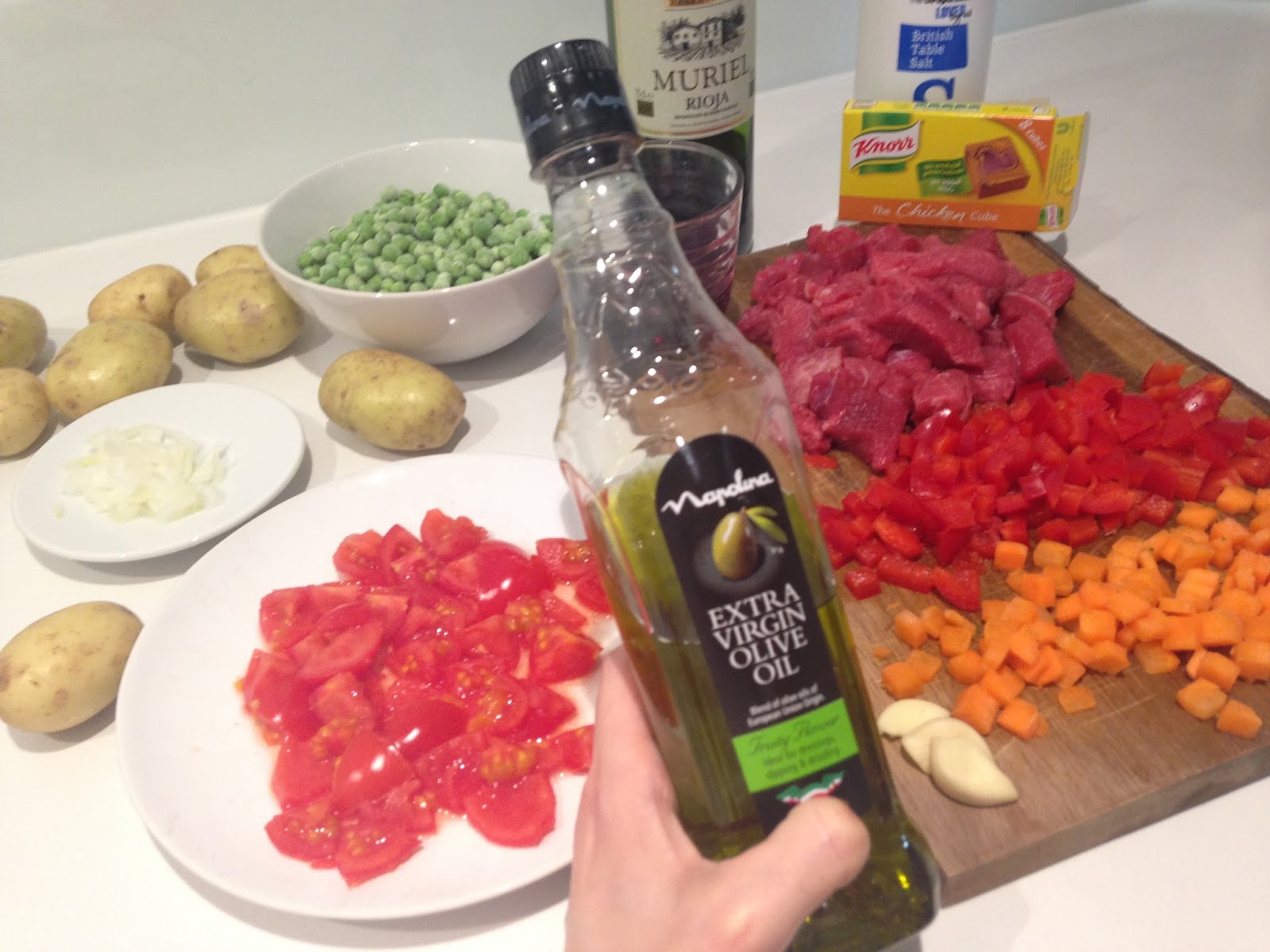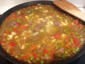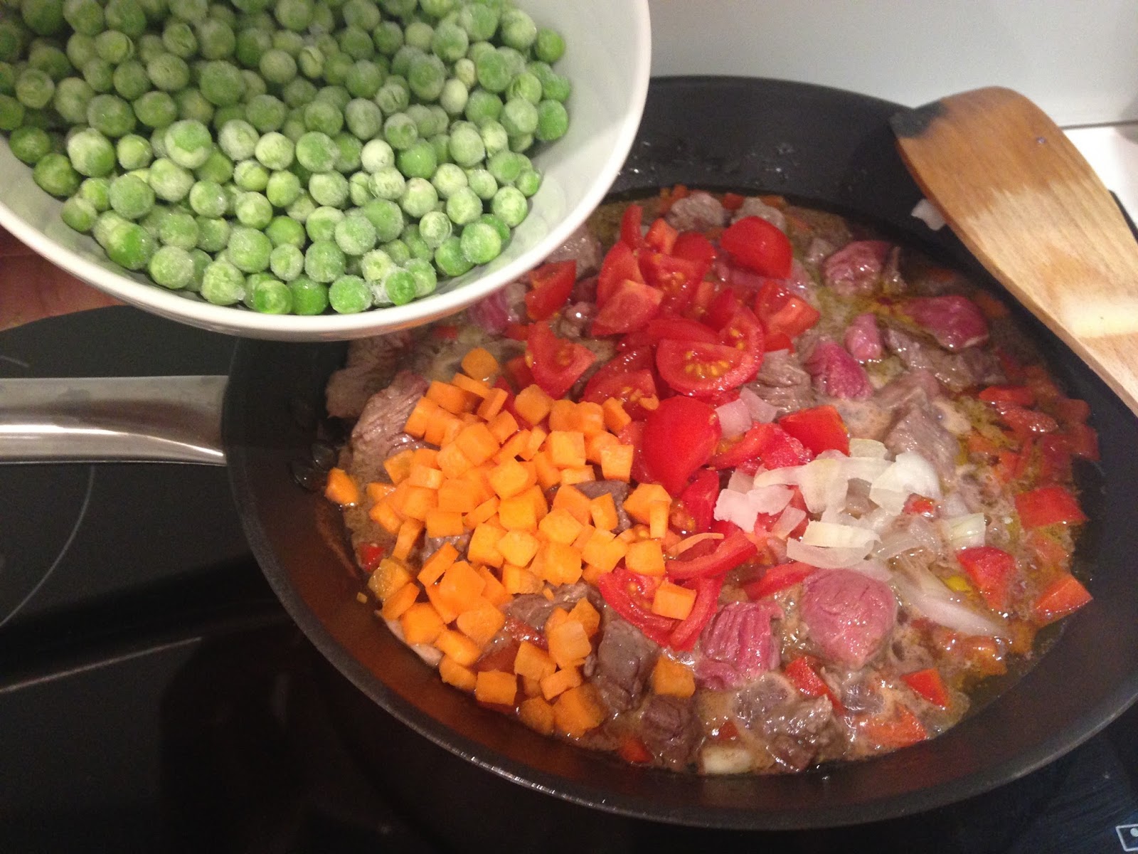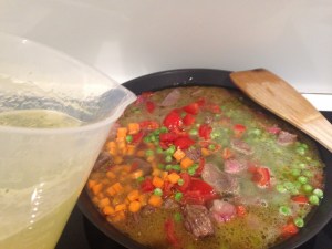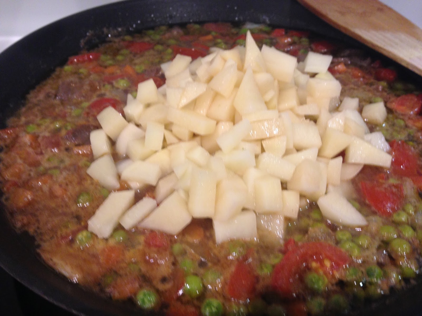 Quando il vino è evaporato aggiungere pomodori, carote piselli e cipolla. Versare nella pentola 500 ml. di brodo di pollo caldo. Lo spezzatino deve sbollire per circa 30 minuti, quindi aggiungere le patate e altro brodo di pollo caldo. Fate cuocere per circa 2 ore e mezza aggiungendo brodo caldo ogni volta che il liquido si ritira.