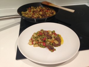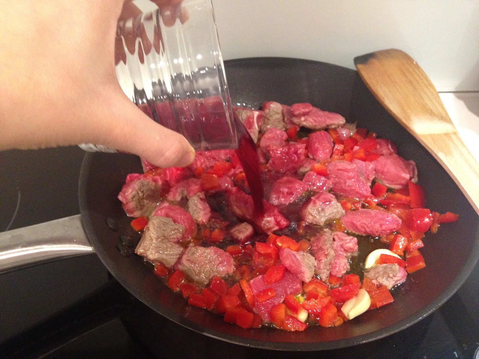 In un tegame antiaderente mettere un po’ di olio poi aggiungere gli spicchi d’aglio e la carne, fate soffriggere 2 minuti. Quindi aggiungere il peperone rosso e sfumare con il vino.