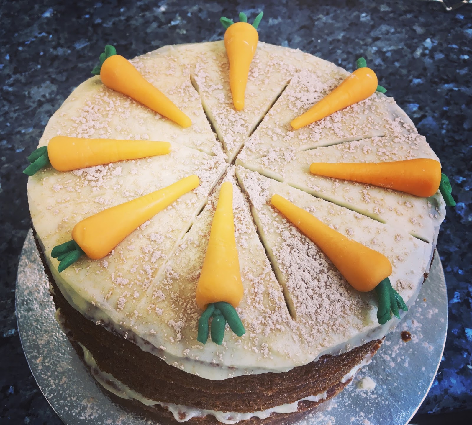 Guarnire ogni strato della torta con il frosting e spalmare un po’ di frosting anche sulla cima. Spolverare la superficie con un mix di zucchero a velo e cannella.