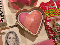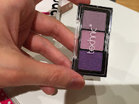 Poi ci sono tre ombretti sul viola, che è il colore di tendenza della stagione; un lip gloss perlato e scintillante; un cuoricino che racchiude un tris di blush.