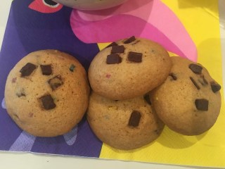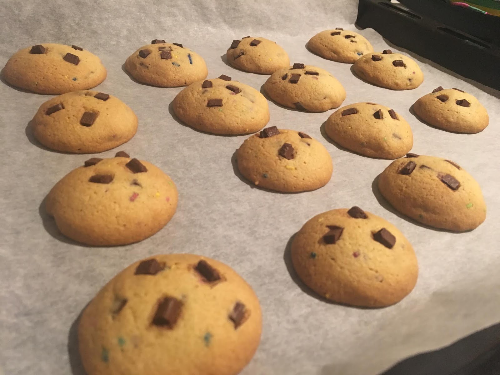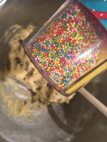 In una ciotola mettere i due tipi di zucchero, l’aroma di vaniglia, il sale e il burro. Montare con le fruste per creare una sorta di cremina. Sempre montando aggiungere le uova, una alla volta fino ad assorbimento. Quindi aggiungere la farina e il bicarbonato, mescolare con un cucchiaio finché l’impasto non diviene omogeneo. Infine unire le pepite di cioccolato e gli zuccherini. Realizzare delle palline e posizionarle sulla placca del forno ricoperta con carta da forno.