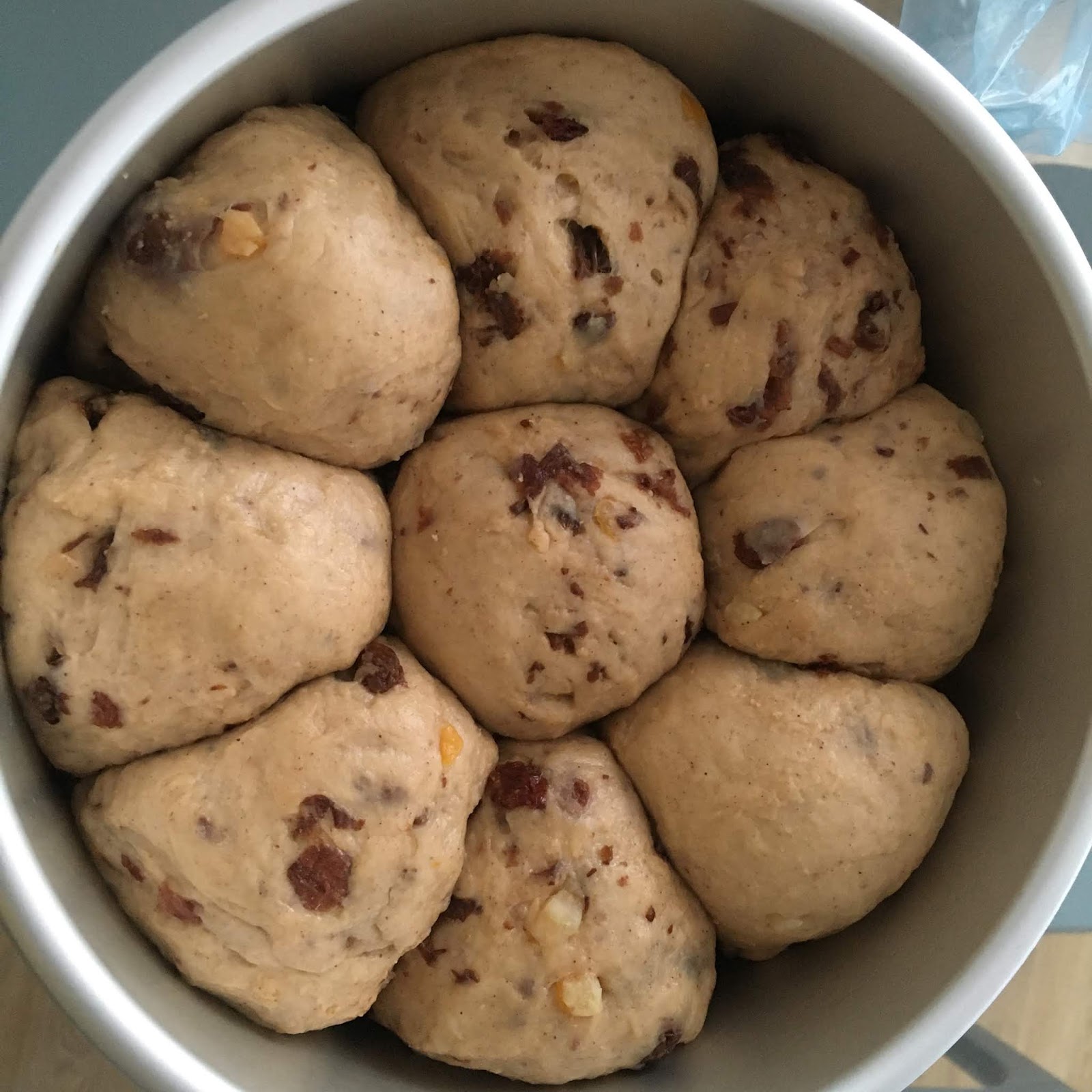 Fate 9 palline (buns) e disponetele sulla teglia o nella tortiera. Sigillare con pellicola trasparente e lasciar lievitare per 1ora.