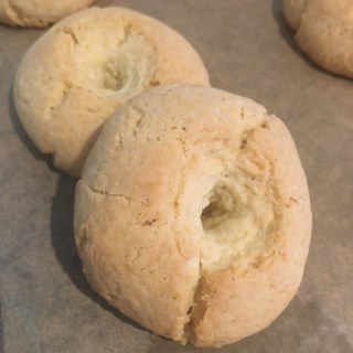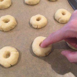 Creare delle palline, schiacciare leggermente e praticare un forellino nel centro (potete farlo con il manico di un cucchiaio o con il beccuccio di una punta da pasticcere, oppure con il vostro dito).