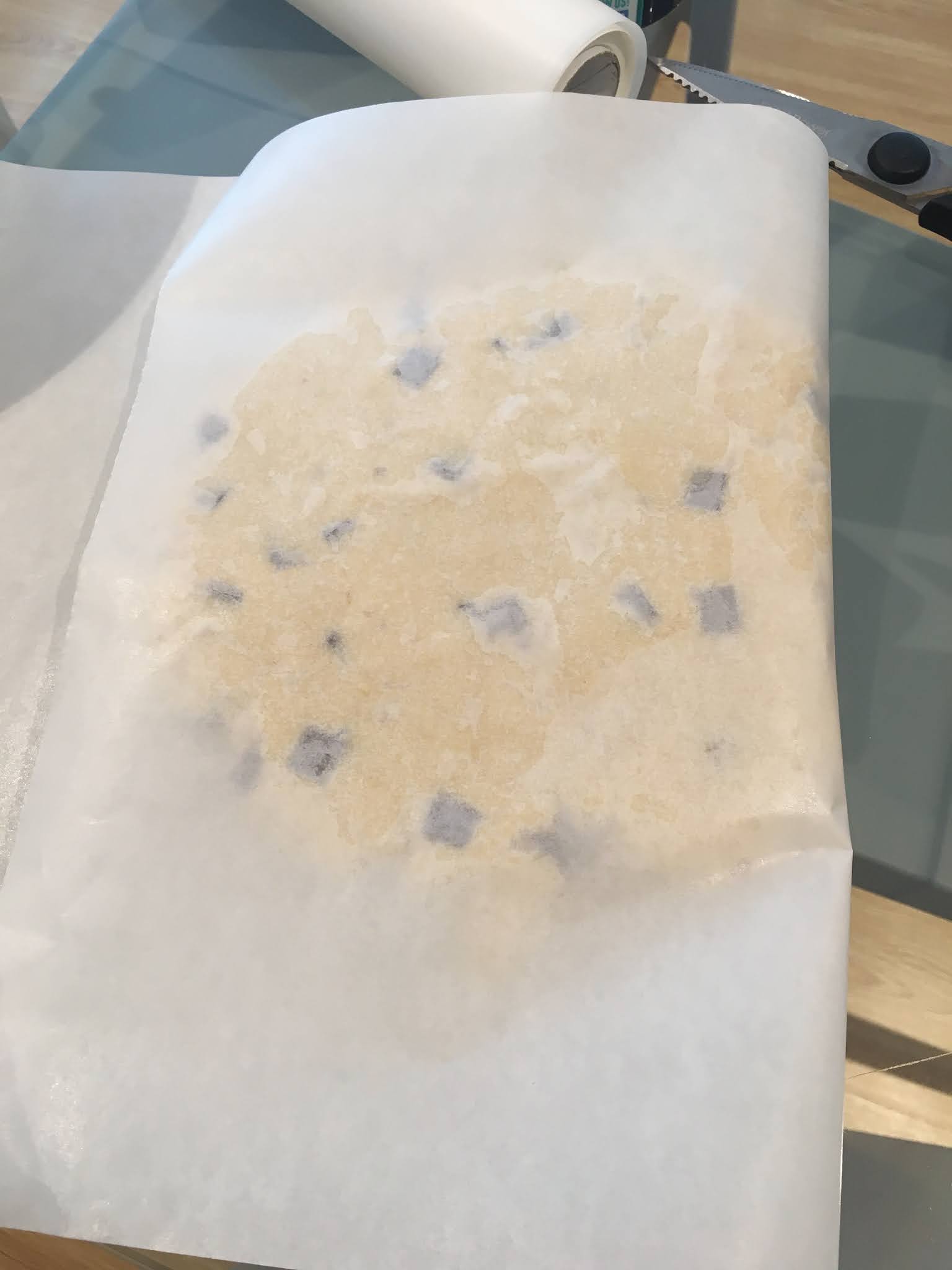 Trascorso il tempo di raffreddamento, stendere la pasta tra due fogli di carta forno con il matterello.