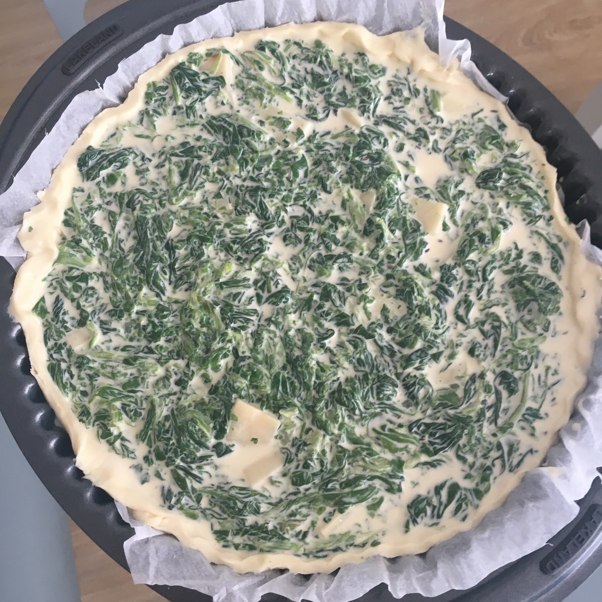 Versare il composto nella tortiera e poi aggiungere i ciuffetti di spinaci e cospargere con un po’ di parmigiano grattugiato.