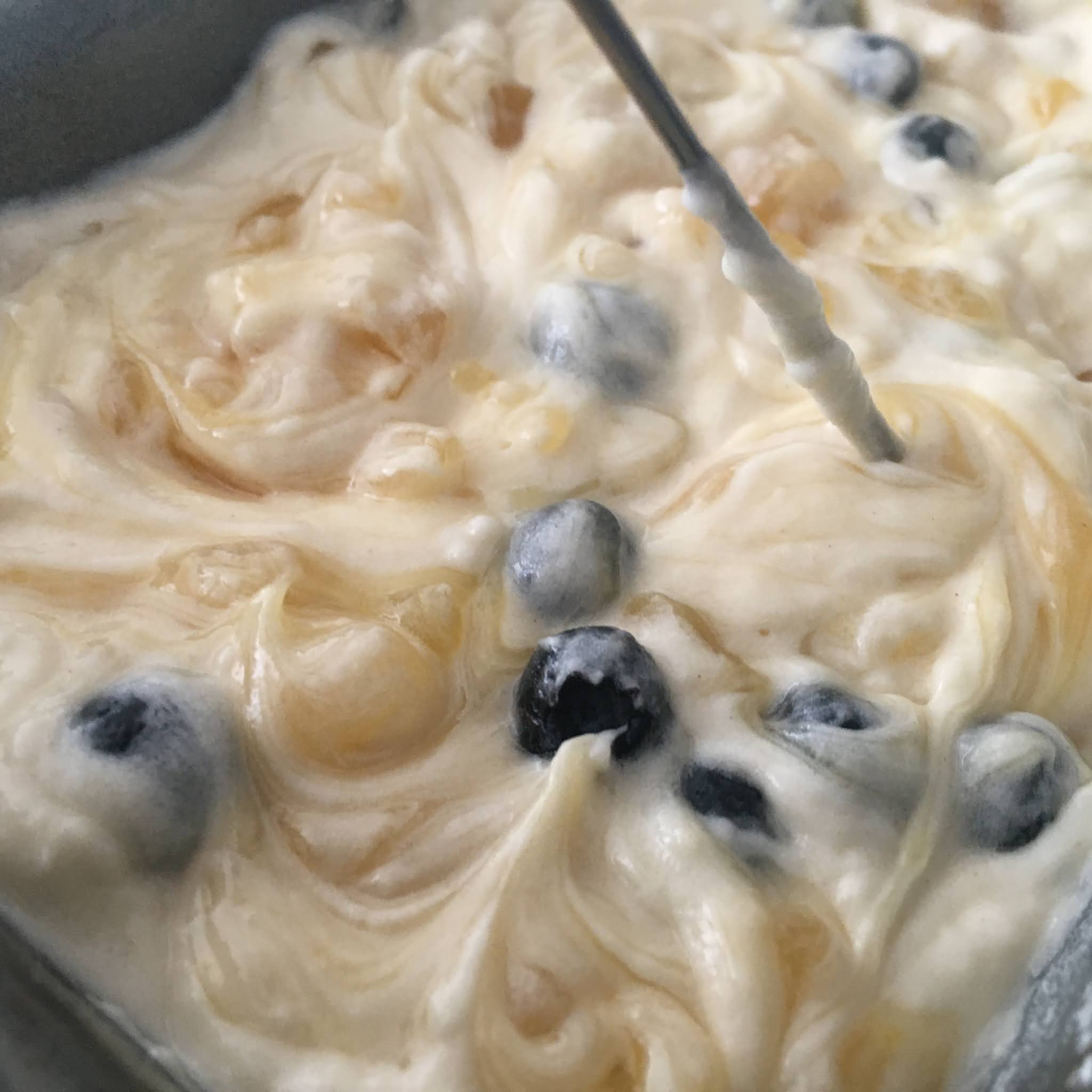 Versare sull’impasto la lemon curd a cucchiaiate, con una forchetta fare dei piccoli vortici in modo che la crema e l’impasto si amalgamino.