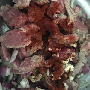 In una pentola capiente mettiamo un po’ di olio, le cipolle e la carne e facciamo cucinare a fuoco medio per 4 minuti. Poi aggiungiamo le spezie (paprika, aglio, origano, chipotle) e mescoliamo bene.