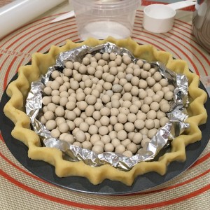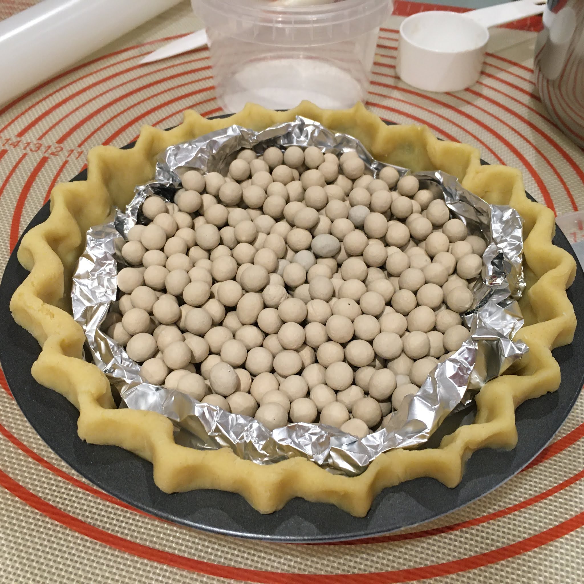 Mettere nella tortiera un foglio di carta forno sul quale adagerete un foglio di alluminio con dentro dei fagioli secchi o dei piccoli pesi in ceramica. Infornare per 12 minuti.