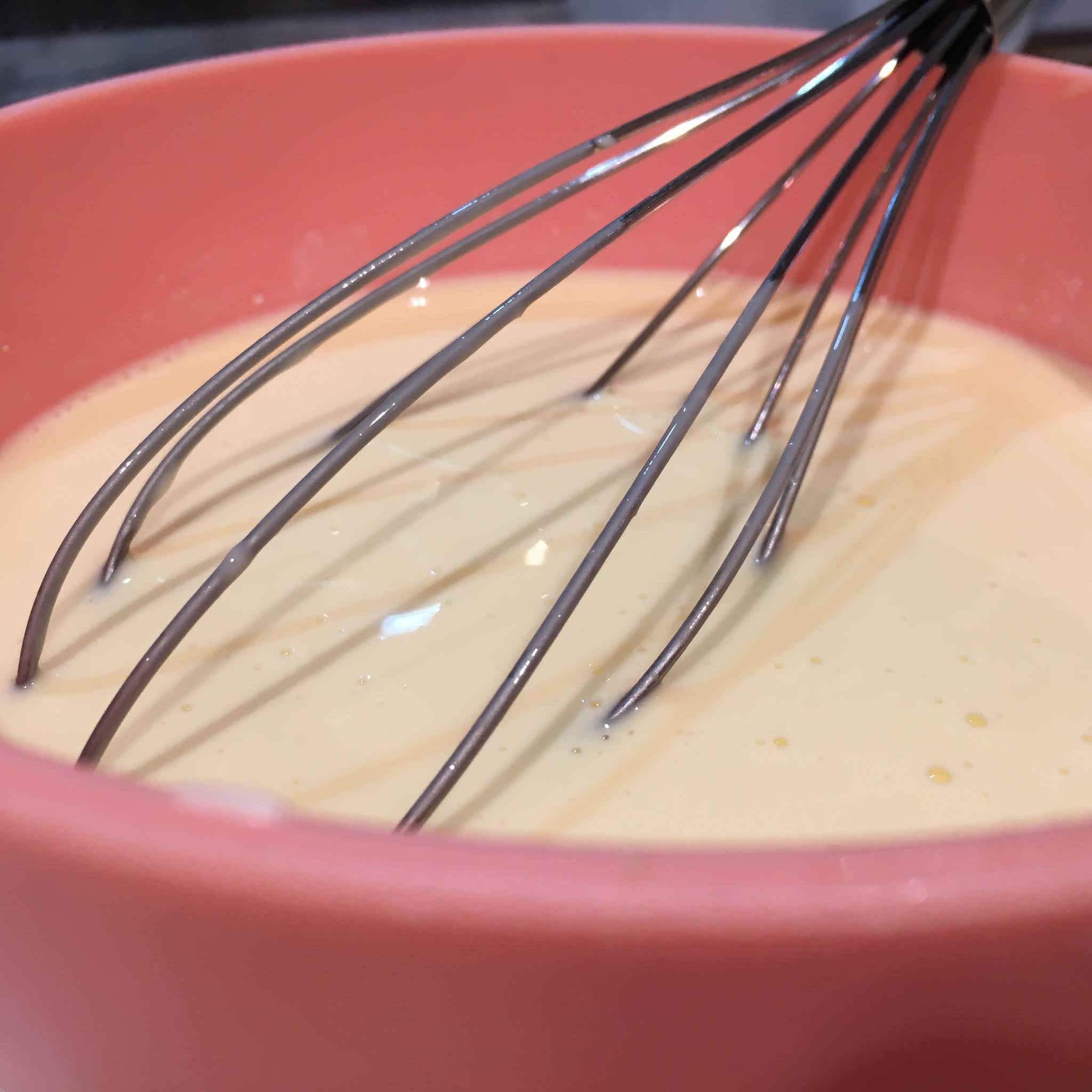 Versare le uova in una ciotola e mescolarle. Unire a poco a poco il latte caldo alle uova e mescolare. Poi versare il composto nella pentola con la zucca e mescolare in modo da ottenere un composto omogeneo.