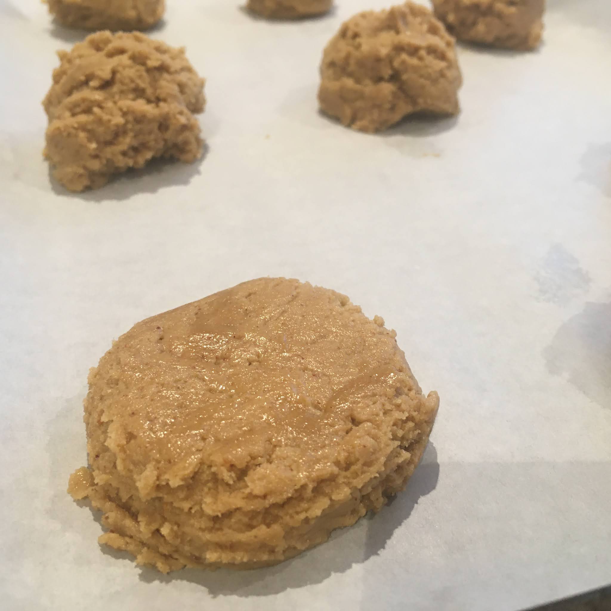 Con un cucchiaio fare delle palline e poi posizionarle sulla teglia (preparata con carta forno) e appiattirle leggermente.