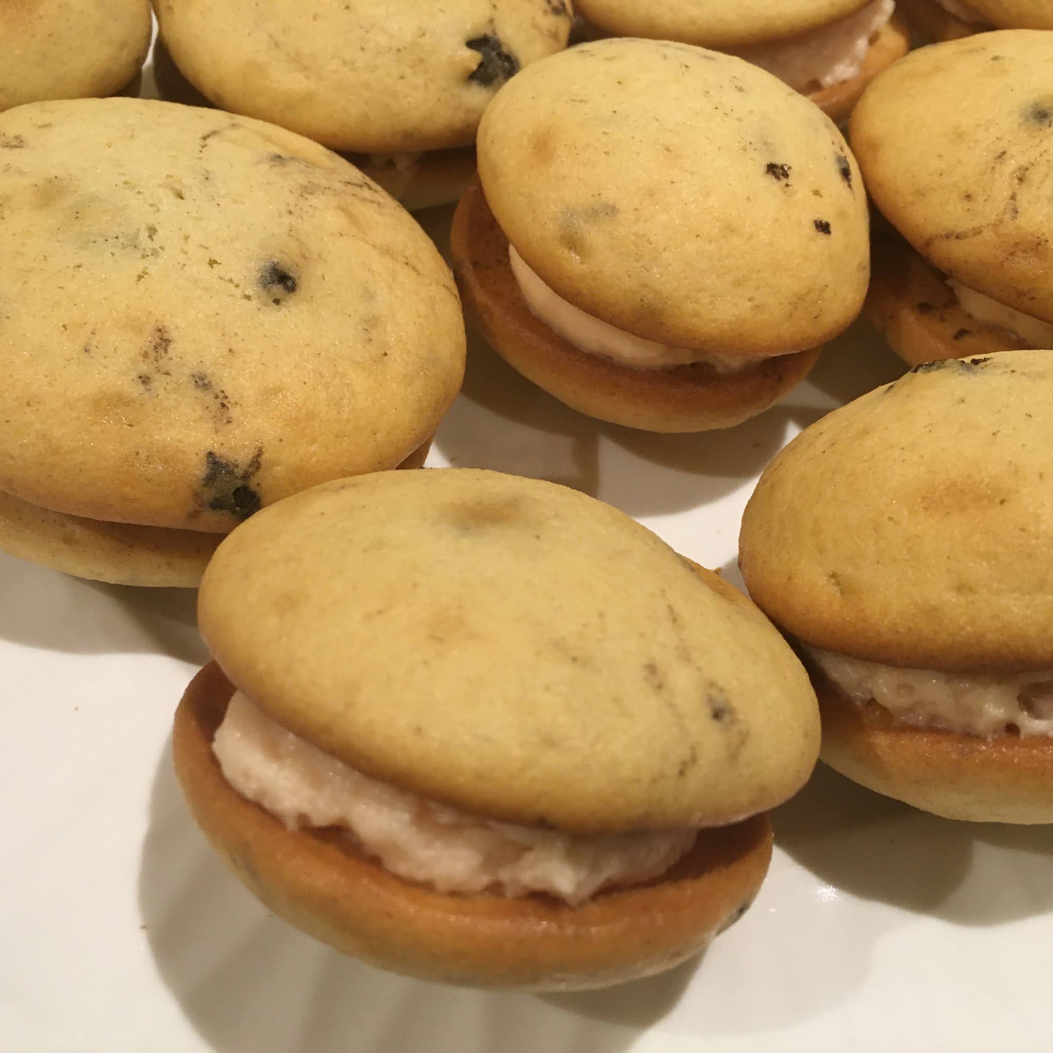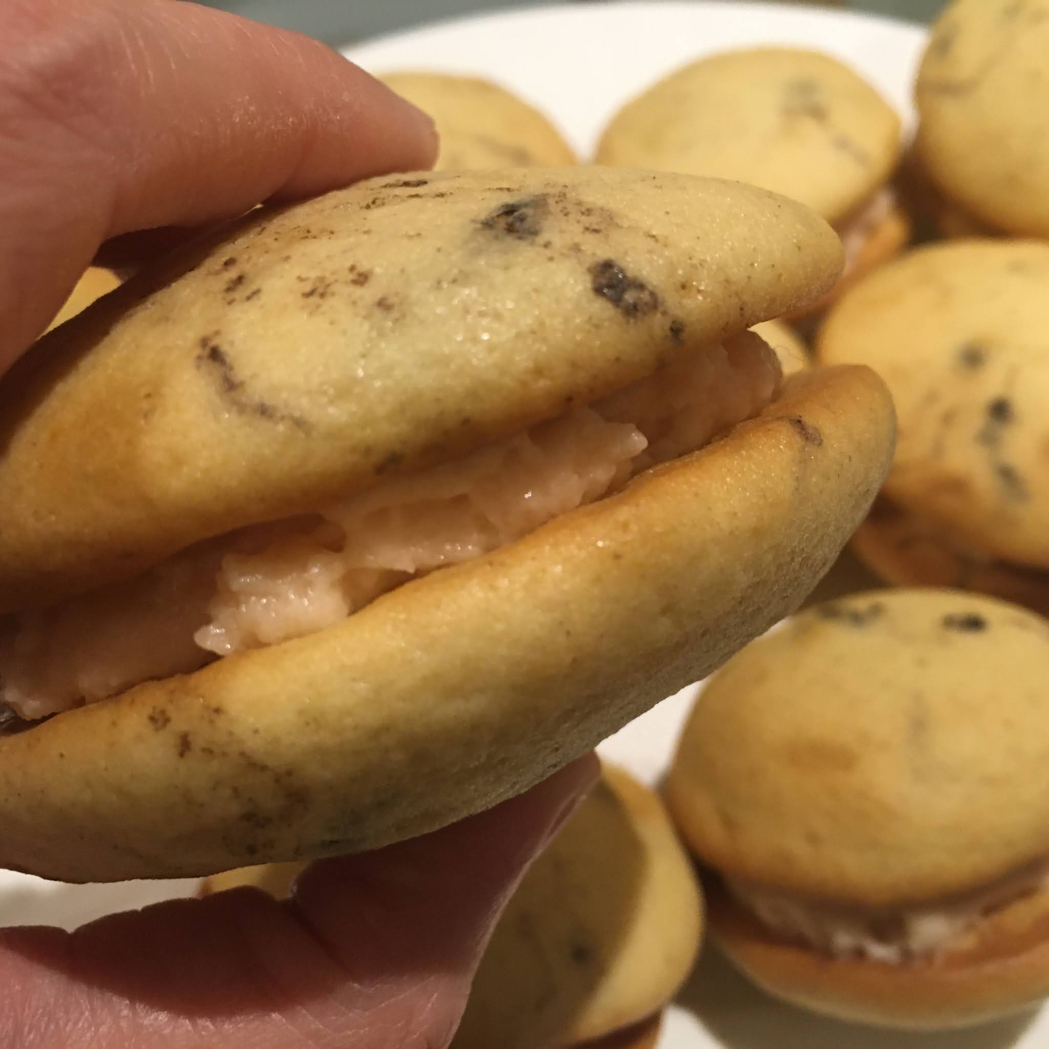Non so quale sia l’origine di questa ricetta, presumo possa essere americana, comunque si tratta di due biscotti molto morbidi che potrete aromatizzare come volete (con pepite di cioccolato, pezzi di biscotto, caramello, frutta secca ecc.), farciti con ciò che preferite oppure ve li potete mangiare anche senza farcia, dipende dalle vostre preferenze.