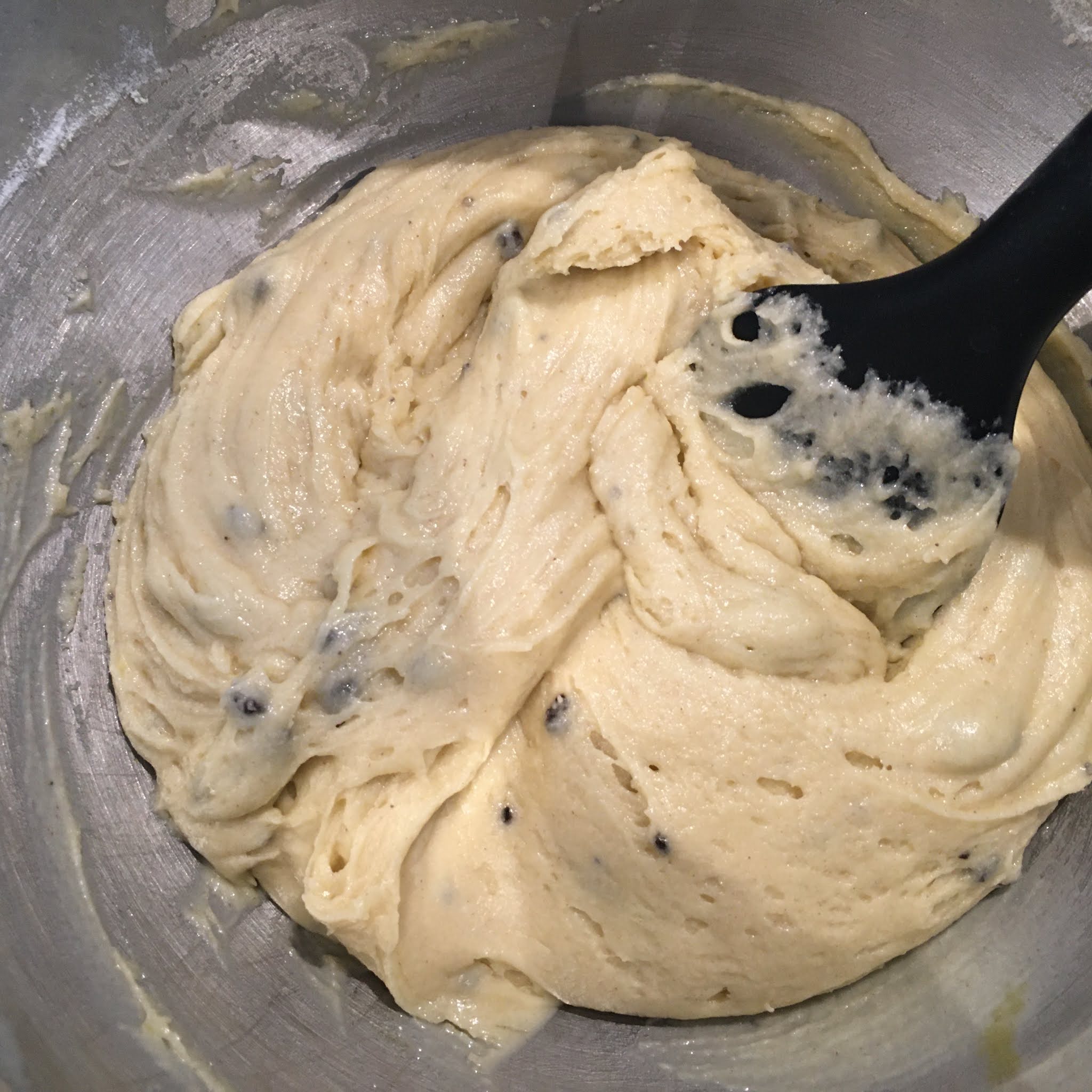 Setacciare la farina con il bicarbonato e il lievito, quindi aggiungere al composto in due riprese. Alla fine inserire i biscotti a pezzetti e mescolare a mano con una spatola.
