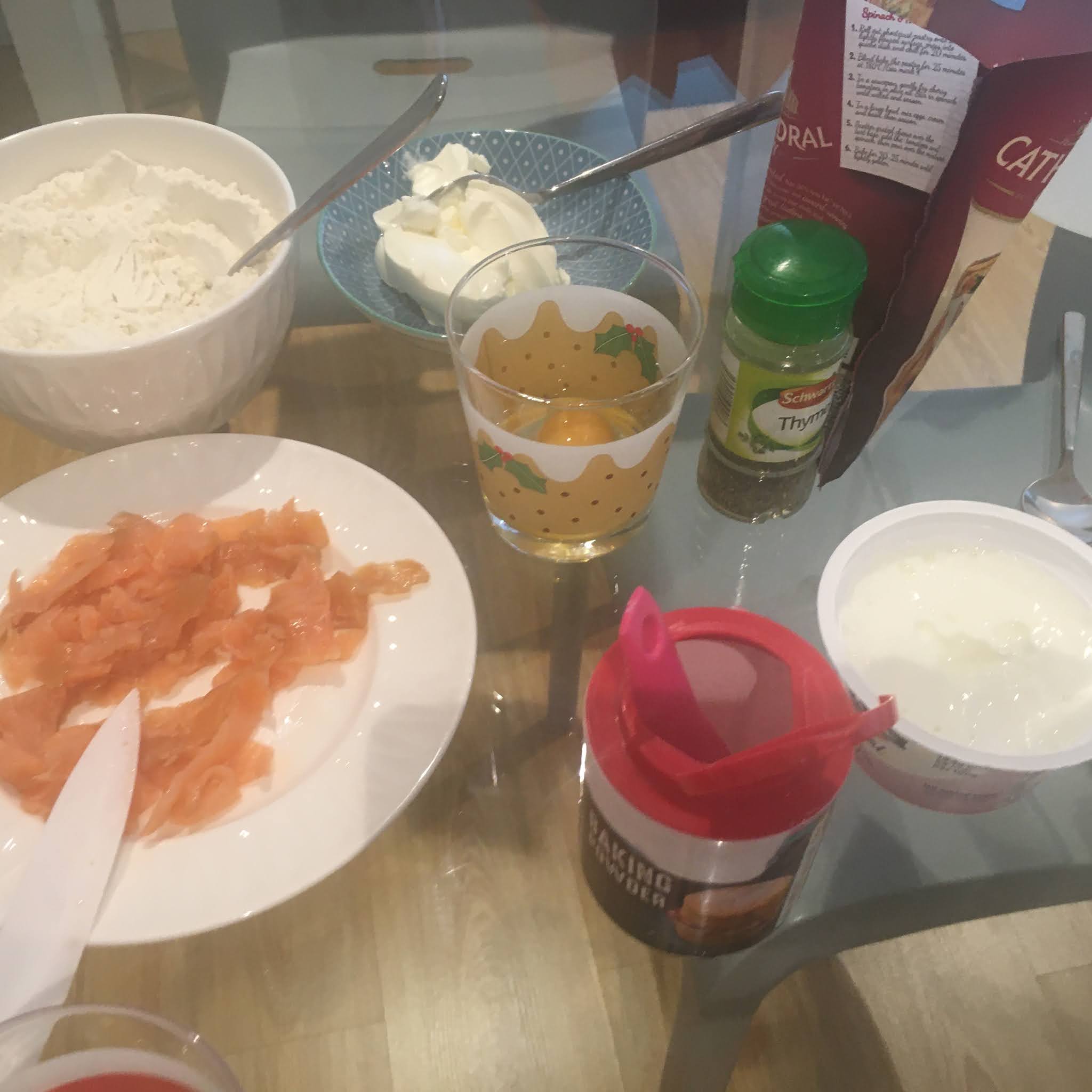In una terrina mescolare la farina e il lievito e poi aggiungere il formaggio, l’aneto e il salmone.