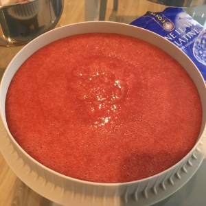 Tritare le fragole col frullatore insieme allo zucchero e fare una purea. Mettere la purea in un pentolino e portare a bollore. Togliere dal fuoco e unirvi la gelatina, strizzata. Mescolare bene e versare nello stampo da inserto. Far intiepidire e poi lasciare in freezer per una notte.