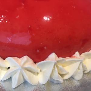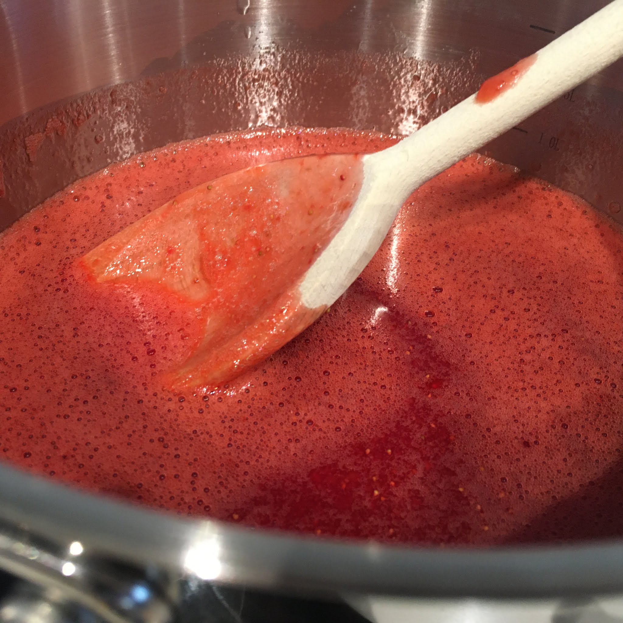 Mettere in una casseruola lo zucchero con l’acqua e il glucosio, mescolare per far sciogliere lo zucchero e poi unire le fragole in purea (frullate), accendere il fuoco e portare a bollore (103°). Quindi togliere la pentola dal fuoco e far raffreddare. Unire il colorante e mescolare. Quando il composto arriva a 60°, unire la gelatina e amalgamare col frullatore ad immersione. Cercate di non alzare e abbassare il frullatore mentre lo usate, altrimenti si formeranno troppe bolle d’aria.
