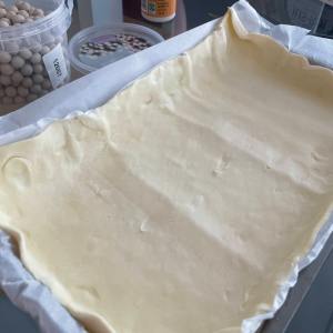 Stendere la sfoglia nella teglia facendola aderire anche sui lati e metterla in freezer a riposare per 10 minuti. Passato questo tempo, rivestire la sfoglia con carta forno e riempirla di palline di ceramica (o fagioli secchi o riso) e cuocerla per 20 minuti. Poi rimuovere le palline e la carta forno, e cuocere per altri 10 minuti.