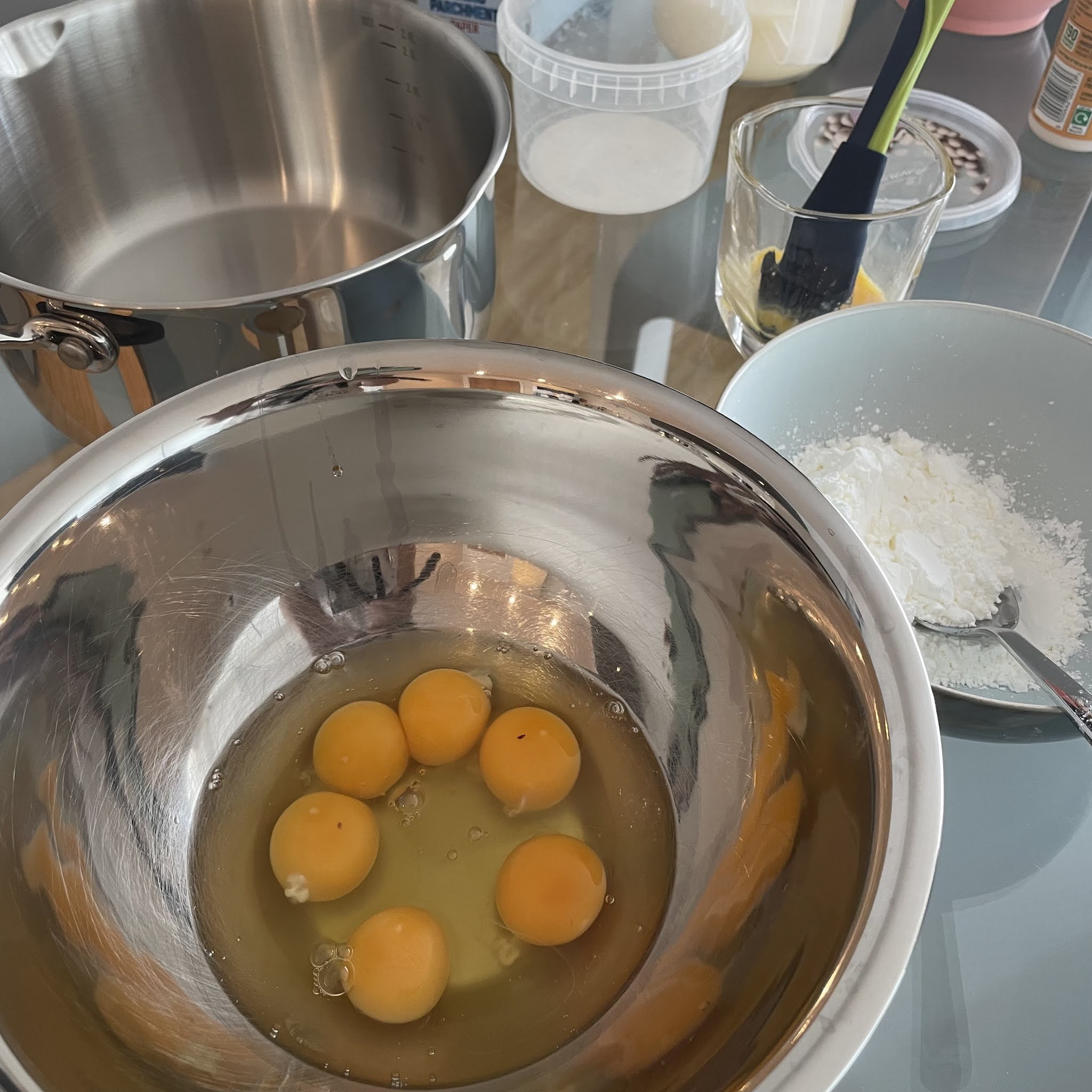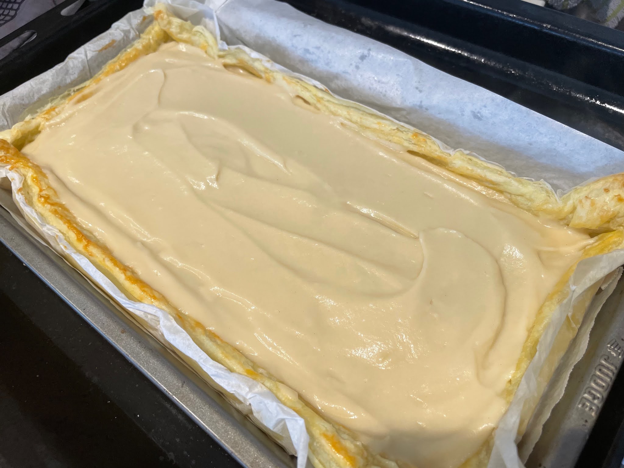 Intanto preparare la crema. Mescolare le uova e la maizena con una frusta in modo da creare un composto liscio senza grumi. Mettere il latte, la panna e la vaniglia in una pentola e portare a bollore. Poi togliere dal fuoco e versare sul composto di uova e mescolare. Rimettere la mistura sul fuoco e aggiungerci lo sciroppo di zucchero, sempre mescolando con la frusta, portare a bollore. Appena la crema diventerà densa, toglierla dal fuoco e versarla sulla base di pasta. Livellarla e infornare per 20/30 minuti la superficie dovrà bruciacchiarsi prima di rimuoverla dal forno.