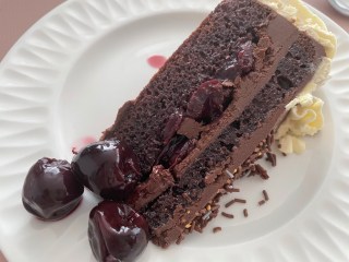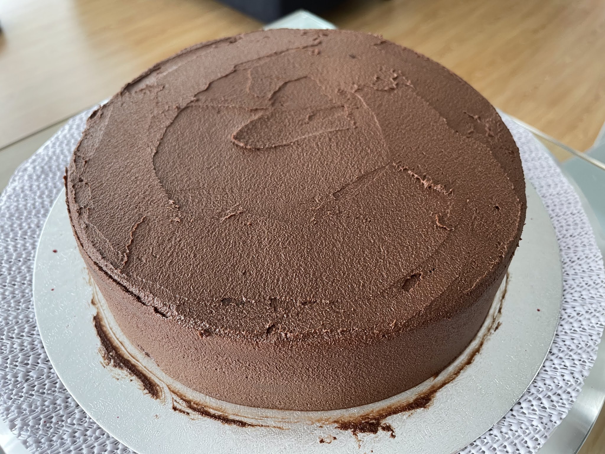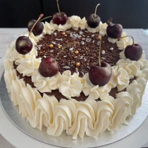 Farcire con la composta di ciliegie e le ciliegie al liquore, coprire il primo strato con abbondante ganache montata. Livellare e poi coprire con il secondo disco di pan di Spagna (ben bagnato su ambo i lati). Decorare con altra ganache sia sopra che sui lati. Livellare bene con una spatola.